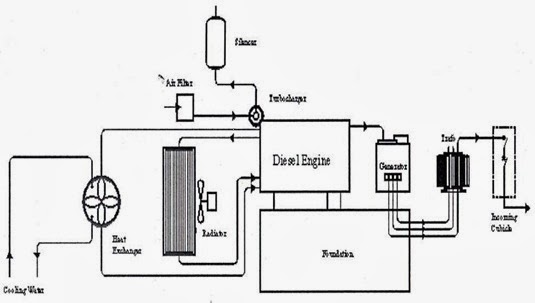 Berikut ini adalah skema dasar dalam pembangkit listrik tenaga diesel.